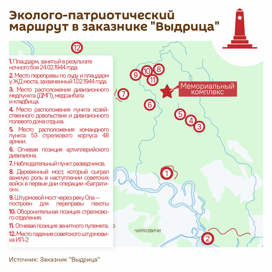 Маршрут свяжет заказник с деревней Ола, где в 1944 году были убиты 1758 мирных жителей. На территории нынешнего заказника в 1943-44 годах шли ожесточённые бои.
